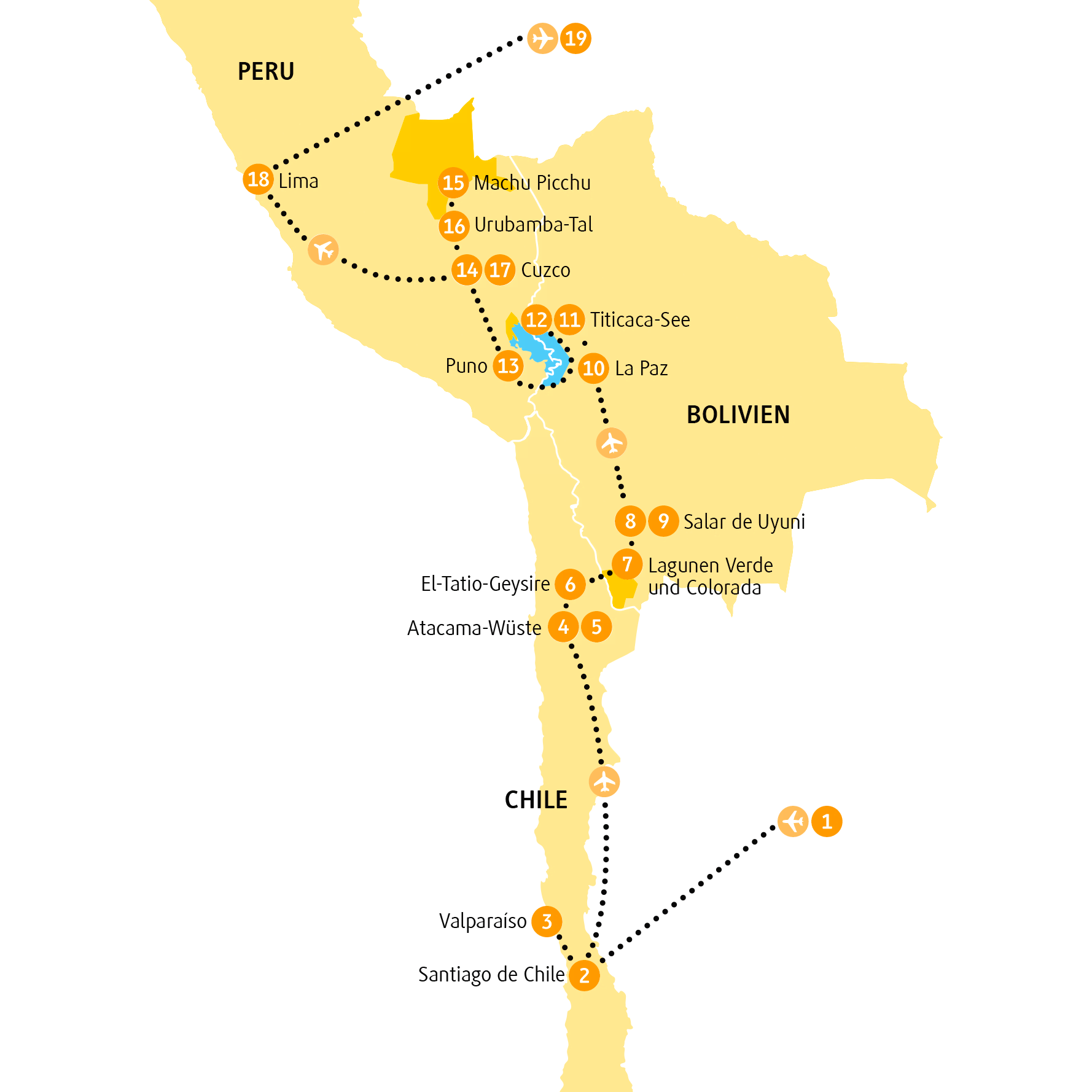 - Regionalflüge von Santiago de Chile nach Calama, von Uyuni nach La Paz und von Cuzco nach Lima